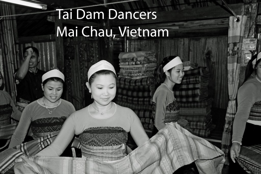 Mai Chau is a district 135 Km Southwest of Hanoi. I stayed with a family and bicycled through rice paddies. After a hard day’s ride, my host asked if I would come to a special dance that night. The Tai Dam dancers were members are an ethnic minority predominantly from China, Northwest Vietnam, Laos and Thailand.