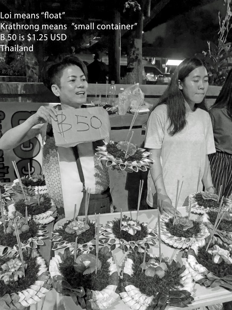 On the night of the full moon, of the 12th month, Thais launch their krattong (float, top picture)) on a river, canal or a pond, making a wish as they do so.