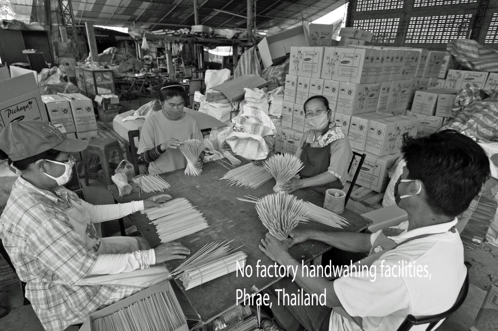 Searching for bamboo coffee stir sticks, I hired a car and took the arduous three-hour drive from Chaing Mai to Phrae, Thailand. The company had a marvelous internet website. They looked solid. I always first ask to go to the bathroom. You can tell much about a factory when seeing their restrooms. Phrae’s toilets were a hole in the ground; no sinks; no hand-wash. Note the lack of gloves as they hand-pack skewers. I’ll never put a bamboo skewer or toothpick in my mouth again. (Individually wrapped toothpicks are fine.)