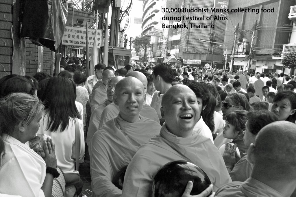 Suvamabhumi Airport, Bangkok, is a major airline hub for southern Asia and Australia. I decided to stay in Chinatown, an area I’ve never visited. Upon checking into the hotel, the clerk said I was a very lucky guy, saying, “Tomorrow morning, at six a.m., the streets will be closed. A Buddhist worship service will be held and thirty thousand Thai monks will parade down the street, collecting food from an estimated one million Buddhists. And, the parade is directly below your hotel room!” So, I’m up at six a.m. and could not believe my eyes. Monks (orange gowns), as far as you could see. Buddhists (white gowns) giving food. Those dressed in black are collecting the food, which will be given to the poor. Loud speakers broadcasting the worship ceremony, with beautiful music playing during the two-hour parade. The hotel sold small packets of food of which guests could purchase. After watching for an hour or so, I headed for the streets, camera in hand, wanting to participate in the ceremony. Previously, when seeing a monk at an airport, I avoided talking with them. They were different. Shaved heads and all. I now know monks dedicate their life to Buddha and the poor. I now talk with every monk I encounter and thank them for their service.