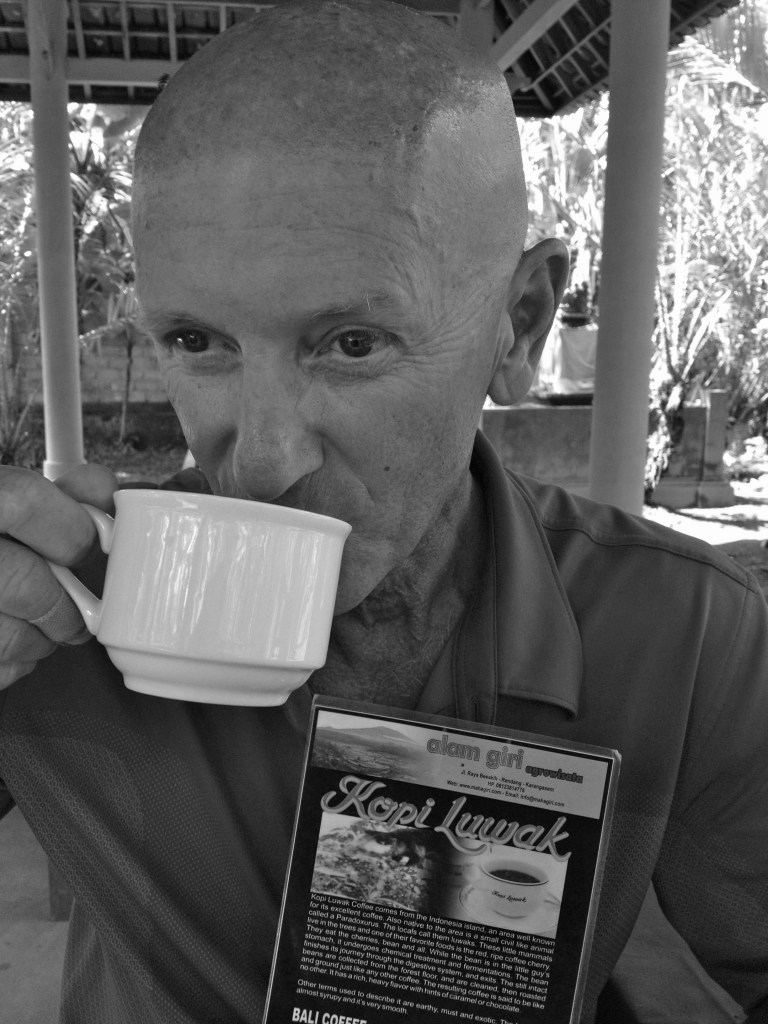 Sipping Kopi Luwak in Bali, Indonesia. Kopi Luwak, or civet coffee, is one of the world’s most expensive and low-production varieties of coffee. It is made from coffee beans that have been eaten by the Asian palm civit (monkey) and other related civets, and passed through its digestive track. A civet eats the berries for their fleshy pulp. In the digestive tract, the civet’s enzymes seep into the beans, making shorter peptides and more free amino acids. After passing through a civet’s intestines, the beans are then defecated, keeping their shape. After gathering, thorough washing, sun drying, light roasting and brewing, these beans yield an aromatic coffee with much less bitterness. All of the above being said, it tasted like cowboy coffee, coffee boiling for a long period of time. One time was enough for me.